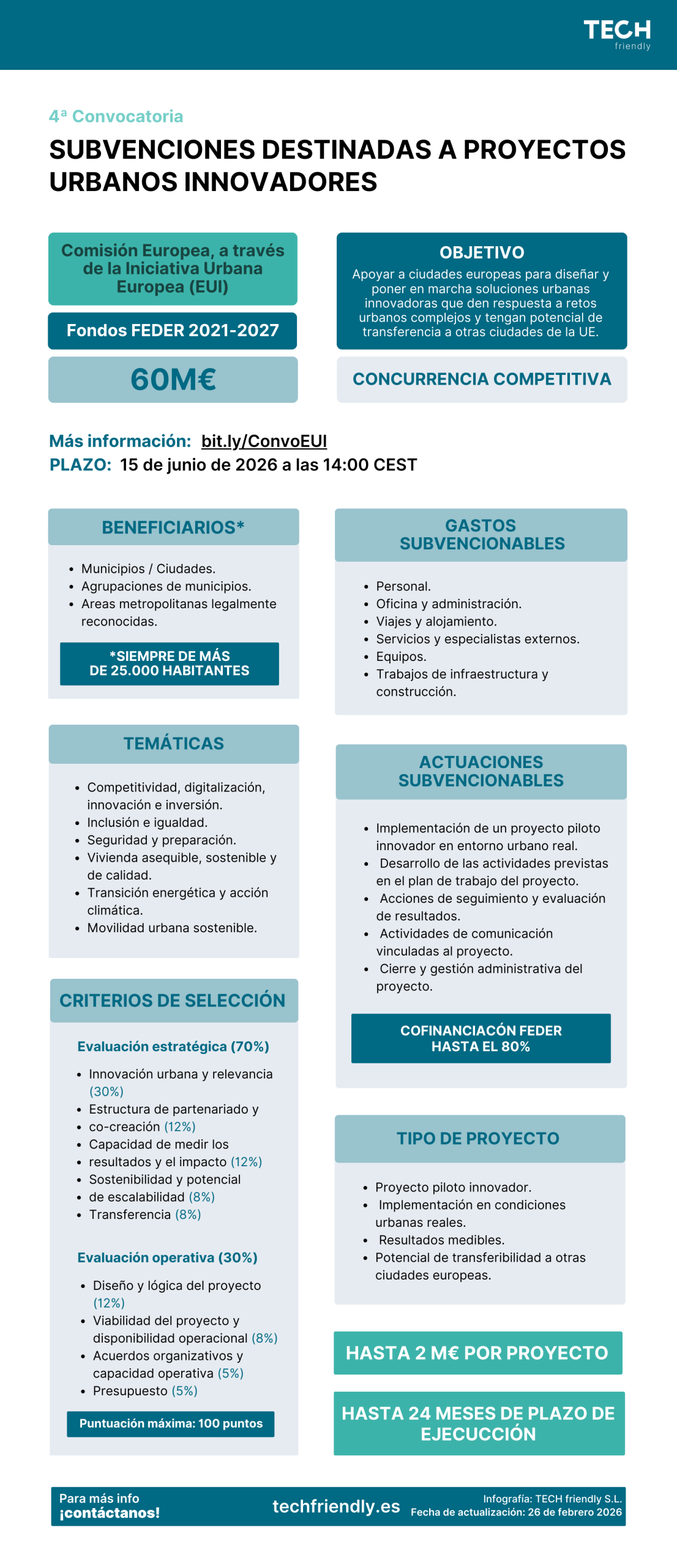 El plazo de presentación de solicitudes es hasta el 15 de junio de 2026, a las 14:00 CEST. Desde TECH friendly nos ponemos a disposición de nuestros/as clientes para aclarar cualquier duda o consulta.