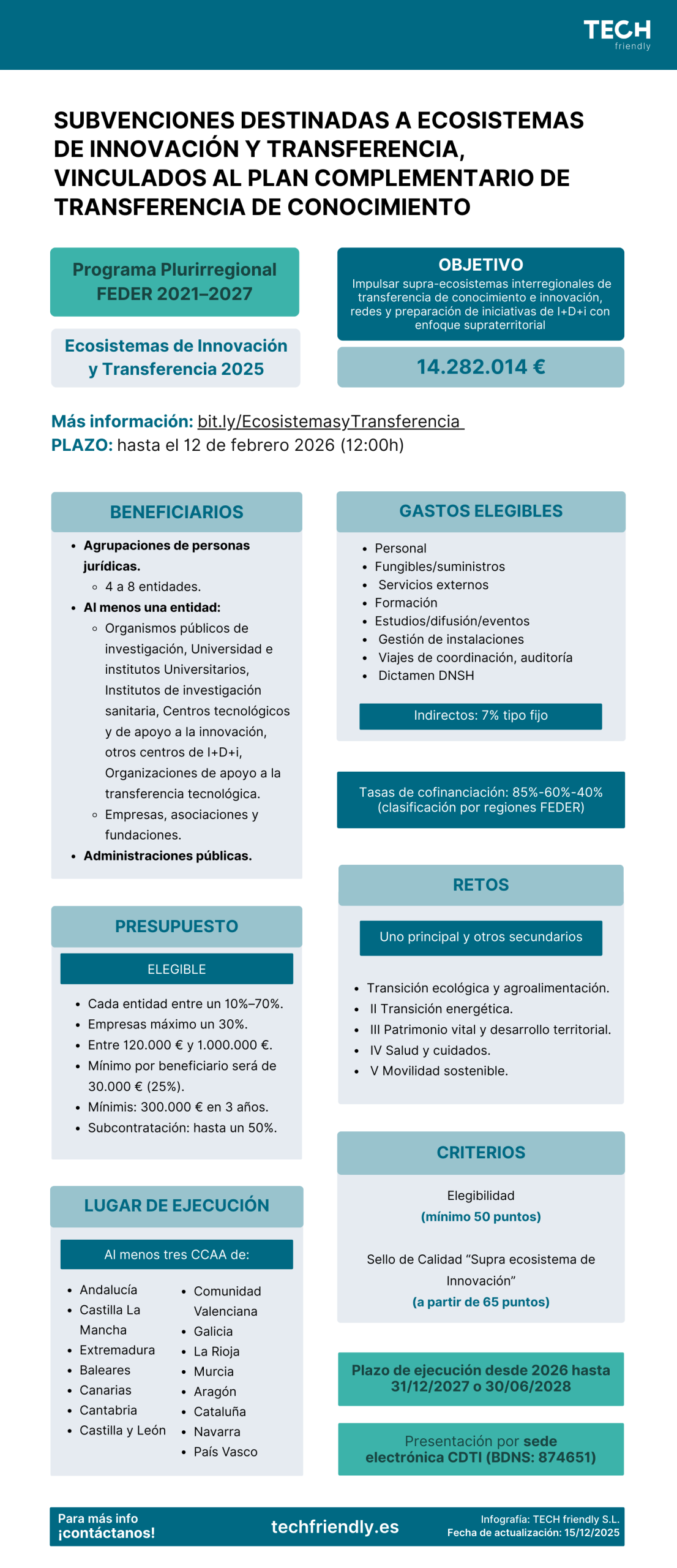 La convocatoria Ecosistemas de Innovación y Transferencia 2025 se enmarca en el Programa Plurirregional FEDER 2021–2027 y tiene como finalidad impulsar supra-ecosistemas interregionales de innovación y transferencia de conocimiento, fomentando la colaboración entre agentes de distintos territorios y la preparación de iniciativas de I+D+i con un enfoque claramente supraterritorial.
